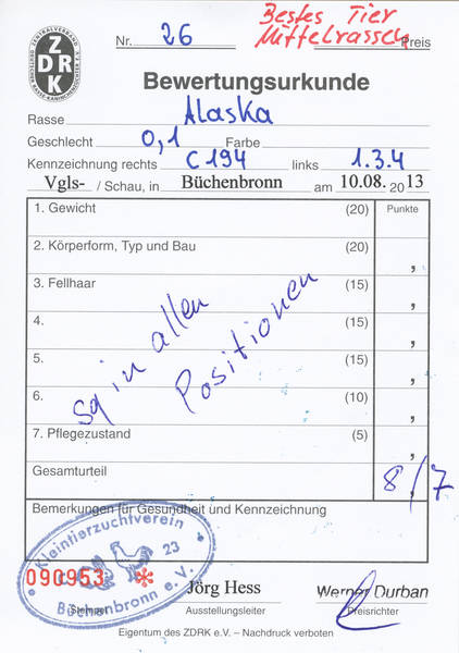 Mit seinen Alaska gewann er alles, was in seiner Klasse zu gewinnen war. Zwei Tiere erhielten die Höchstnote "8/7", was mit dem besten Tier der Schau bei den Mittelrassen sowie einem Sonder-Ehrenpreis belohnt wurde. Mit der Sammlung und der höchsten Gesamtpunktzahl aller Aussteller wurde er außerdem überlegener Büchenbronner Meister.
